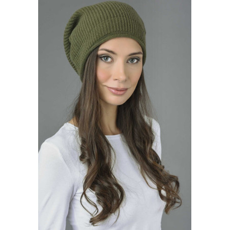 Pure Cashmere Ribbed Knitted Slouchy Beanie Hat in Loden Green
