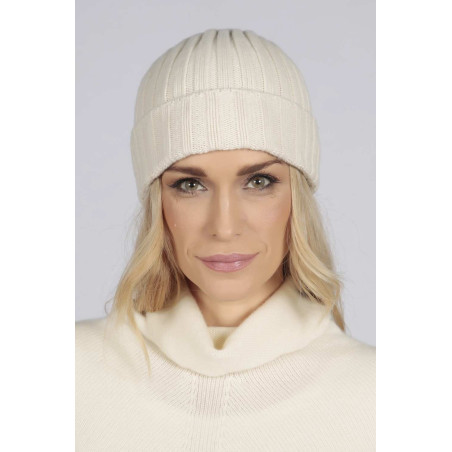 Cream White pure cashmere wide ribbed fisherman beanie hat