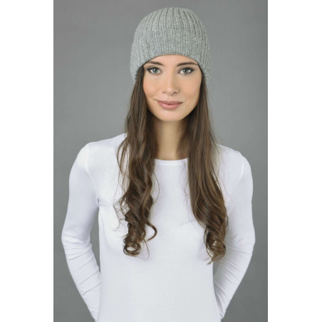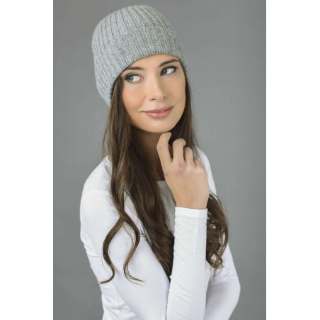 Confectionné en Italie en 100% cachemire et légèrement côtelé. Un bonnet exclusif de cachemire de haute qualité en gris clair en ajout à vos vêtements d'hiver. parfait pour skier ou simplement se promener en hiver.