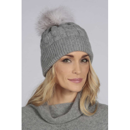 Bonnet pompon en fourrure en tricot torsadé pur cachemire en gris clair