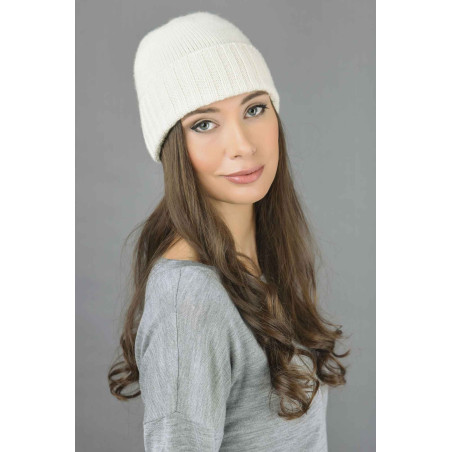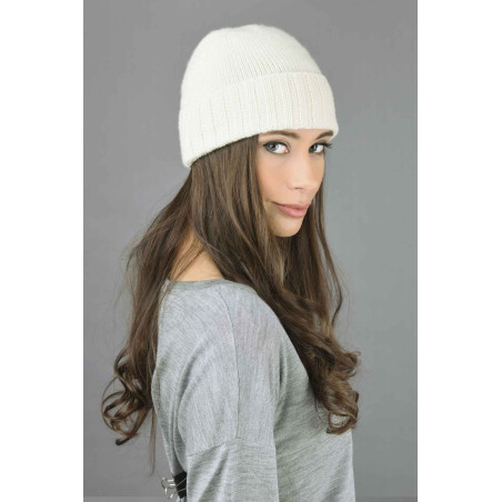 Cappello maglia rasata con risvolto a coste Bianco panna in puro cashmere